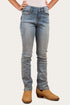 The Daphne Kids Bootleg Jeans are a stretch denim garment, created from a soft and breathable cotton blend. The mid rise design sits comfortably below the belly button whilst the bootleg tapers off below the knees, providing a comfortable and practical choice. Side splits at the hems are a functional and fashionable detail, allowing this mid-rise style to sit neatly over boots making them perfect for the avid horse rider or for the youngster who appreciates both style and practicality. Signature western inspired embroidery features on the back pockets, giving the Daphne's traditional western edge whilst woven labels and branded hardware complete the look with Ringers Western authenticity.